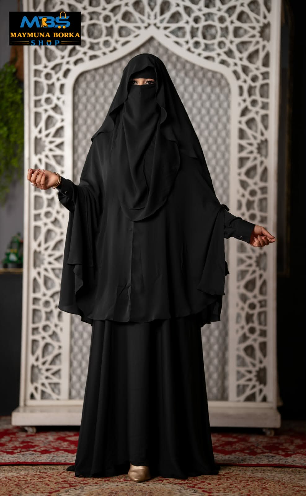 আভিজাত্য ও পর্দার পূর্ণতা: মোত্তাকী বোরকা সেট - ৩ পাটের হিজাব ও ২ পাটের নিকাব (সম্পূর্ণ দুবাই চেরী ফেব্রিক)